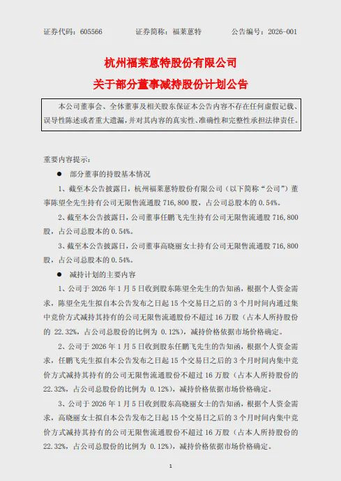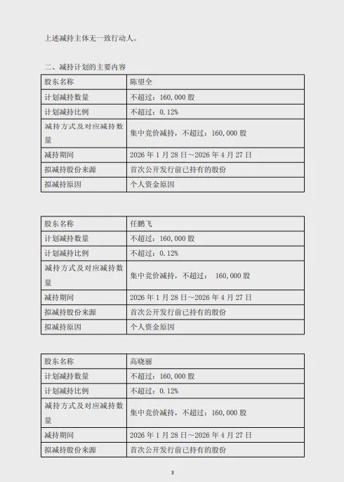 1、公司于2026年1月5日收到股东陈望全先生的告知函,根据个人资金需求,陈望全先生拟自本公告发布之日起15个交易日之后的3个月时间内通过集中竞价方式减持其持有的公司无限售流通股份不超过16万股(占本人所持股份的22.32%,占公司总股份的比例为0.12%),减持价格依据市场价格确定。