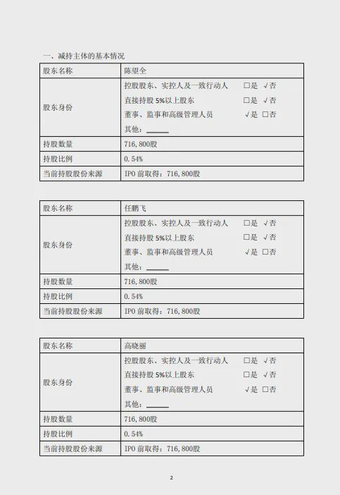 2、公司于2026年1月5日收到股东任鹏飞先生的告知函,根据个人资金需求,任鹏飞先生拟自本公告发布之日起15个交易日之后的3个月时间内集中竞价方式减持其持有的公司无限售流通股份不超过16万股(占本人所持股份的22.32%,占公司总股份的比例为0.12%),减持价格依据市场价格确定。