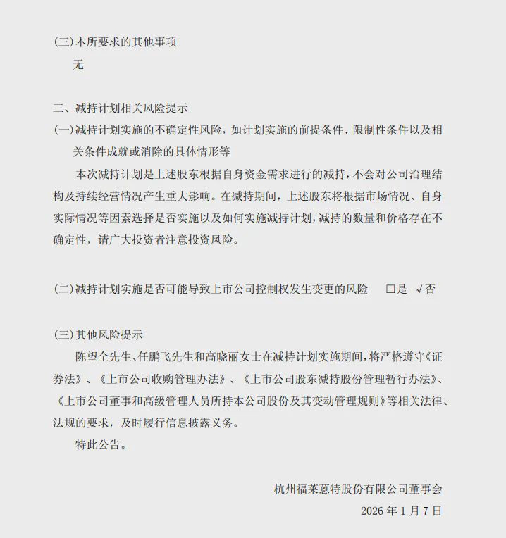 3、公司于2026年1月5日收到股东高晓丽女士的告知函,根据个人资金需求,高晓丽女士拟自本公告发布之日起15个交易日之后的3个月时间内集中竞价方式减持其持有的公司无限售流通股份不超过16万股(占本人所持股份的22.32%,占公司总股份的比例为0.12%),减持价格依据市场价格确定。